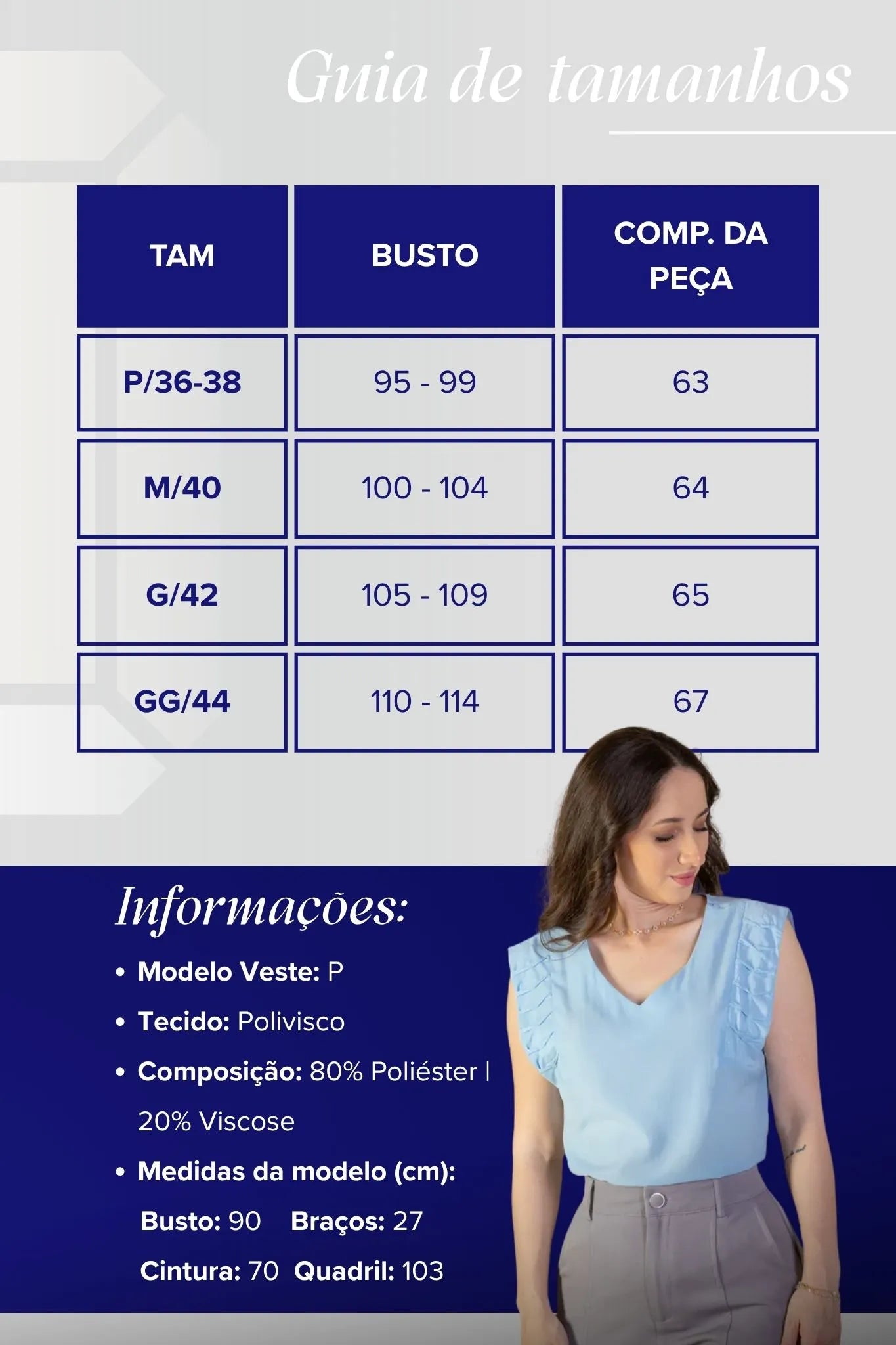 Uma peça indispensável para compor looks práticos, femininos e cheios de personalidade. Ideal para quem deseja uma peça leve, elegante e com presença, como Fátima.