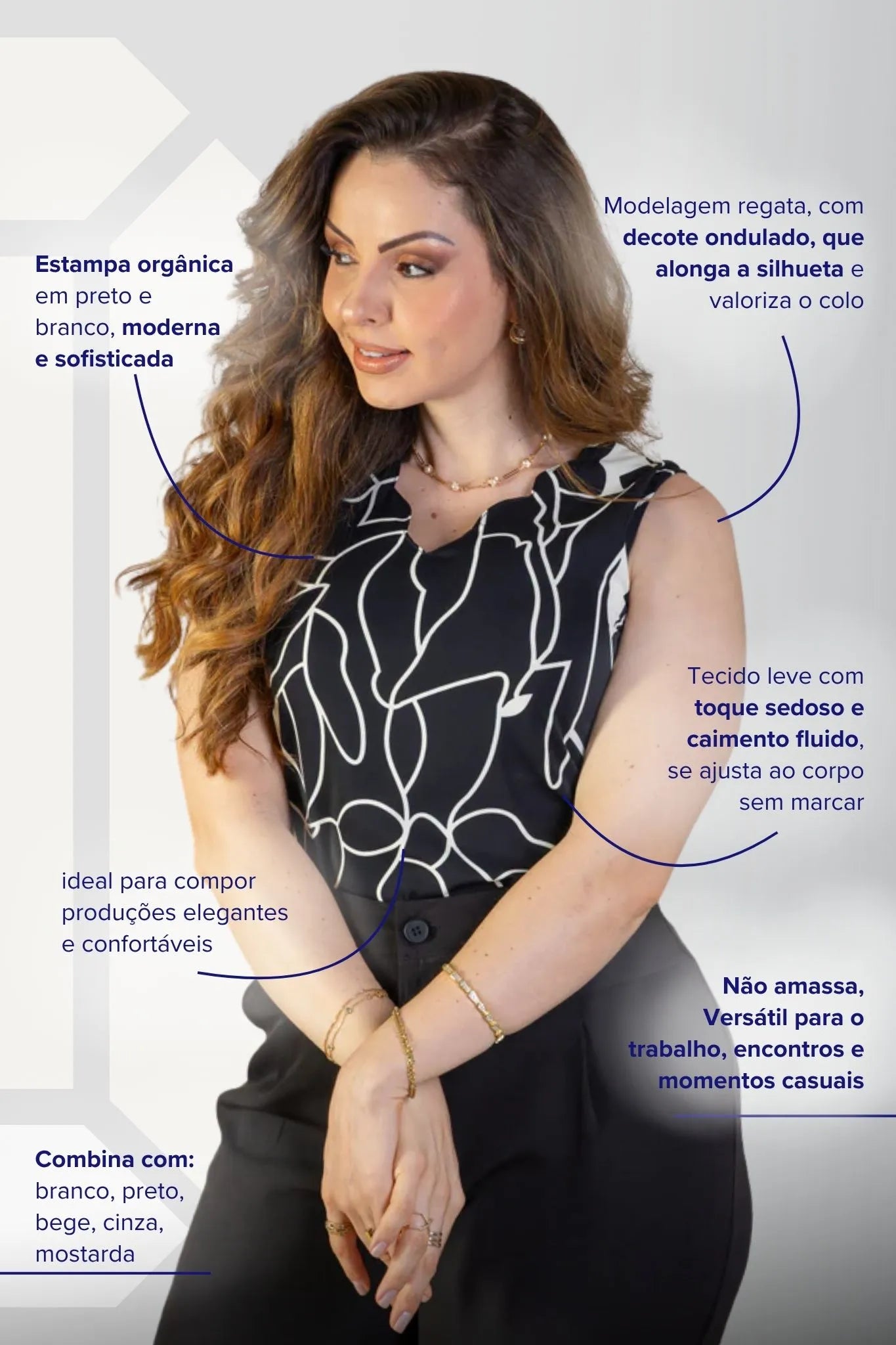 Blusa Regata Detalhe Decote Crepe Classic Estampada Hebe Camargo Preta
