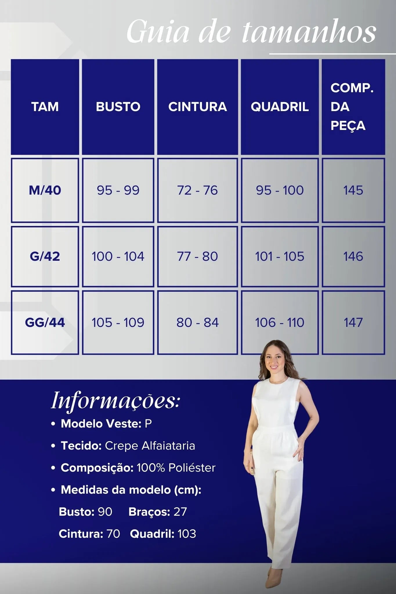 O modelo possui decote redondo, sem mangas, cintura com elástico embutido que valoriza a silhueta e pernas retas que alongam o visual. Confeccionado em tecido leve com ótimo caimento, garante conforto e liberdade de movimentos sem perder a elegância.